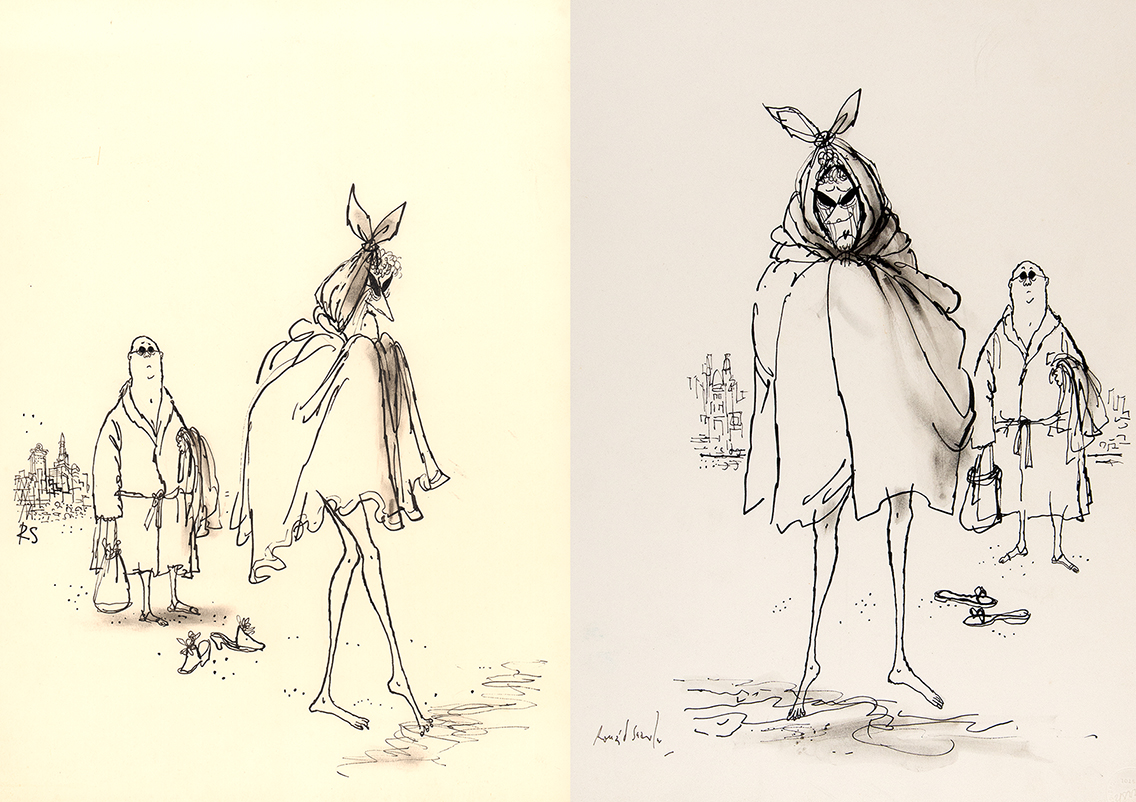 Searle was so prolific I've found there's always more work to discover. In the book I have two finished versions of a drawing of a 'Miami couple' (Holiday magazine, December 1963). Recently on eBay a sketchbook page cropped up with studies on both sides where Searle seems to have experimented with both angles.