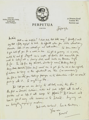 British Artist and Satirical Cartoonist. A.L.S., Ronald, one page, 4to, London, 30th July 1952, to Nicolas Bentley ('Dear Nick') on the printed stationery of Perpetua Limited. Searle informs his correspondent that he didn't fully enjoy a book, commenting 'It's difficult when you dislike almost every character. Still - it was interesting - and well written.' He further informs Bentley that he has to go away until the end of August on a couple of features, 'but meanwhile you could be looking out a drawing which would make an American laugh for £10', explaining, 'The wife of a big New York advertising man (Mr. Henry Bach of Henry Bach Associates!) [Inc. Inc.] wants me to get for her one or two originals of cartoons to hang in their apartment over there. (no commission!) She fell in love with your trotting passenger in the Sedan chair - but we weren't parting with it. So anything like.' In concluding Searle asks 'Did I tell you we are doing the odd book under this firm? Our first on dramatic criticism, critics and such subjects will be out in October and we hope it will sweep the profession! If it doesn't we'll have to give it away with ice creams in the Interval. Any way we are thoroughly enjoying ourselves.' VG