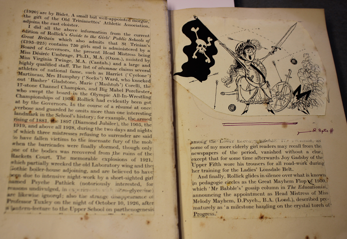 Publisher’s ‘dummy’ copy of The Terror of St Trinian’s, Ronald Searle’s first joint effort with Timothy Shy, aka D B Wyndham Lewis. Every illustration and printed text carefully pasted into place, complete with handwritten corrections and comments