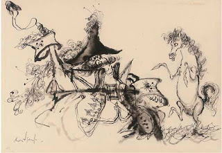 'The adventures of Baron Munchausen', by R.E. Raspe and others, profusely illustrated by RonaldSearle was first published in 1969. The style of the illustrations was informed by a series of almost abstract expressionist ink drawings Searle made the previous year entitled 'Anatomies & Decapitations'.