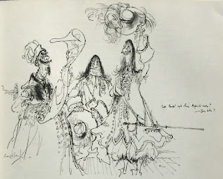 The drawings produced for The Great Fur Opera form a unique group within the Hbc Collection. Searle's style is remarkably detailed and yet gives the appearance of having been drawn in haste. His drawings have an almost sketch-like feel to them, with "scribbled" shading, dots and swirls used to convey the sense of movement, depth, atmosphere and emotion. His compositions are a mass of detail, every line adding personality and zing to the subject, engaging the eye as it searches through the welter of marks and scratches to enjoy the oddities of character and circumstance Searle uncovers in his subjects. The figures he draws, whether kings or paupers, are infused with personality through a variety of weird abnormalities of appearance. A large gnarled nose, spiky unkempt hair, large uncouth mounds of facial hair, elongated and thick buck-teeth, uproariously large and beady eyes, unusually long and stringy limbs, gaping mouths, silly grins, unnaturally large boots on bean-pole legs - these are just some examples of the exaggerated and ludicrous physical deformities and strange attire that Searle uses to great effect.